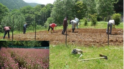 クラブハウス上とゴミステーション前の2か所で、そばを栽培していました。7月始め頃石ころだらけの土地を耕して種を播き、鹿除けの柵を立てます。間引きや草取りなど手入れをして9~10月に刈り取りです。乾燥、脱穀の後製粉してもらってやっとそば粉となります。手が足りず4年で中止となりましたが、この粉で打つ蕎麦は格別の味でした。