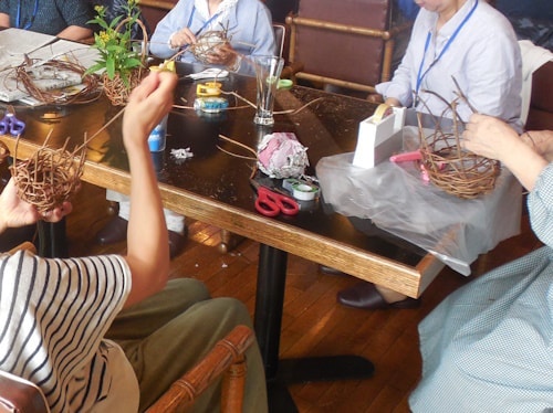 会員の吉川由美子さんご指導のもと、アケビのランナーを使って乱れ編みの篭を作りました。
