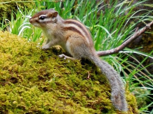 在来種のニホンリスが樹上で多く活動するに対し、シマリスがよく目撃されるのは地上です。 昼行性で、しばしば崖の水抜き穴に出入りしたりせせらぎコースを移動したりしています。 植物の種・昆虫・小鳥の雛や卵を食べますが、生態系に及ぼす影響は未だ不明だそうです。
