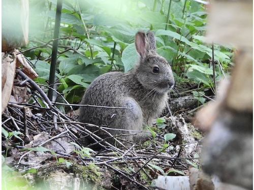 成獣は体長50cm前後ですが、この個体は25㎝ほど。子どものようです。 ノウサギは日本の固有種で、亜高山帯までの森林などで単独生活をします。積雪のある地域では冬に耳の黒を除いて白くなり、春から徐々に茶褐色に変わるそうです。