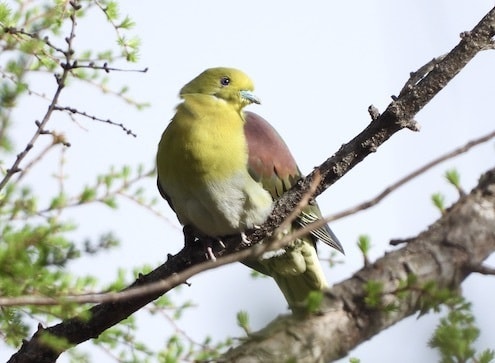山鳩の一種です。体は緑色で、眼と嘴はブルーです。写真の個体はオスです。鳴き声はアーオーアーと長く響きます。高い樹木の上に止まっていますので、スコープが必要です。