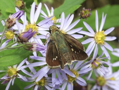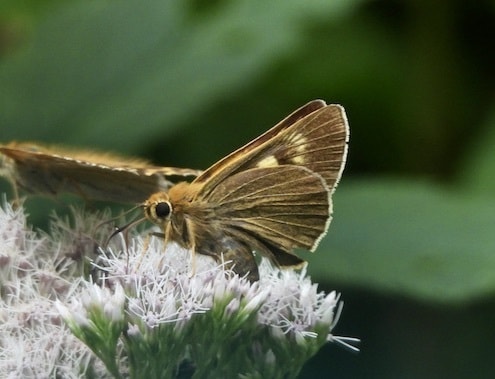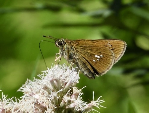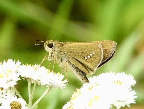 コチャバネセセリと比べると、大きいです。後翅の白い斑点模様も違います。翅を開くと、茶色の翅と緑の体毛が綺麗です。