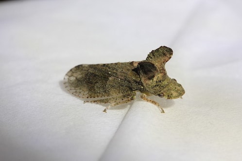 ツノゼミの仲間です。家の窓にへばり付いていることが多いです。極小さいですが拡大すると、面白い顔です。フクロウに似ているでしょうか。