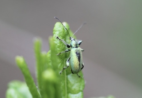 小型のゾウムシです。1cm未満ですが、光沢感のある緑色をしています。何故か家の玄関によく止まっています。口吻は短いです。