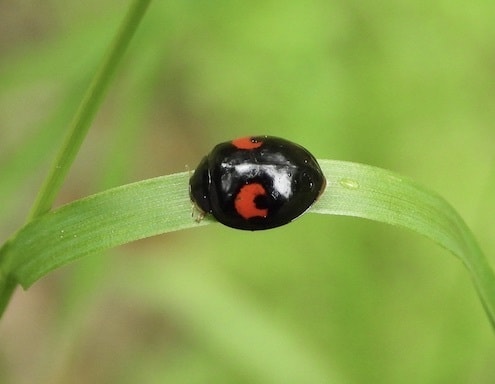 シロホシテントウの仲間は白い星の数で名前がついています。シロホシテントウは12個、2・4・4・2のはずですが、よく見ると、2・4・6・2です。これじゃシロジュウシホシテントウなのですが、この場合、2・6・4・2の並びなのです。細かすぎますね。ナミテントウのように、一括りの名前でいいのでは、と思ってしまいます。