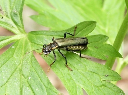 コガネムシの仲間です。1cmぐらいの小ささです。背中の薄い黄色の筋が名前の由来です。緑色の光沢があります。