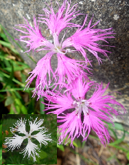 里~山地~亜高山の草地 左:白花 カワラナデシコは苞が3~4対 タカネナデシコは花が更に細かく裂ける。